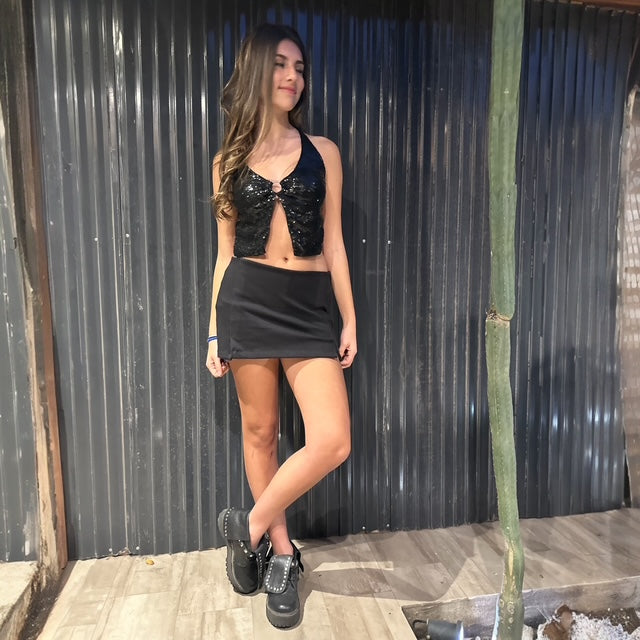 Descubre la Falda Short Lisa Negra, donde estilo urbano y comodidad se encuentran.