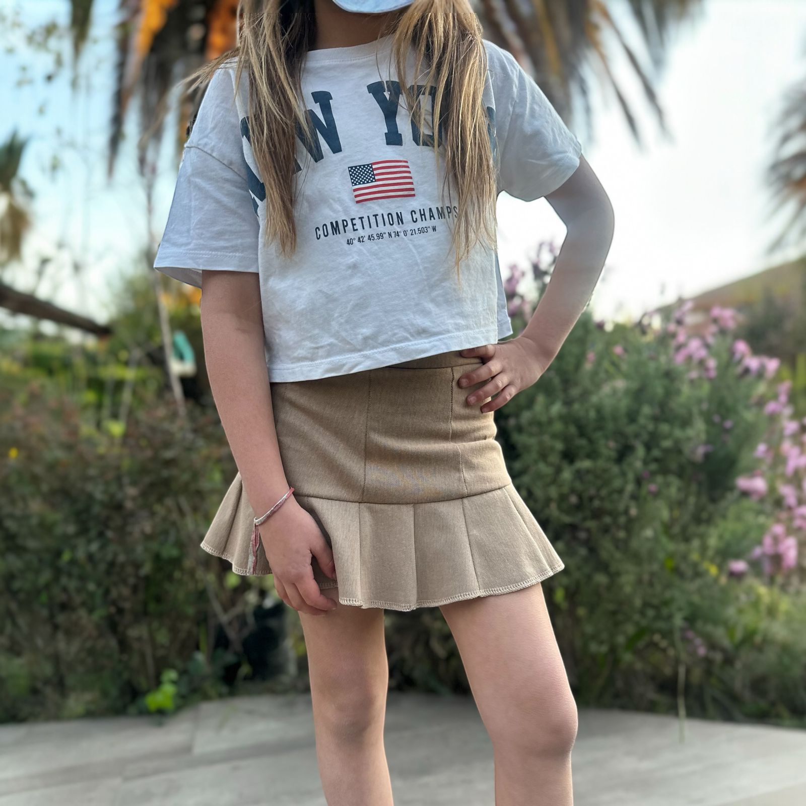 Mini falda short de niña en color verde, perfecta para el día a día. Cómoda y con un diseño moderno que combina con cualquier outfit.