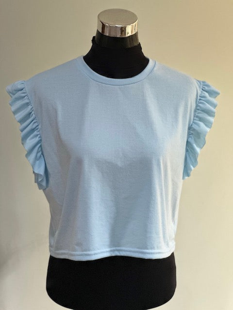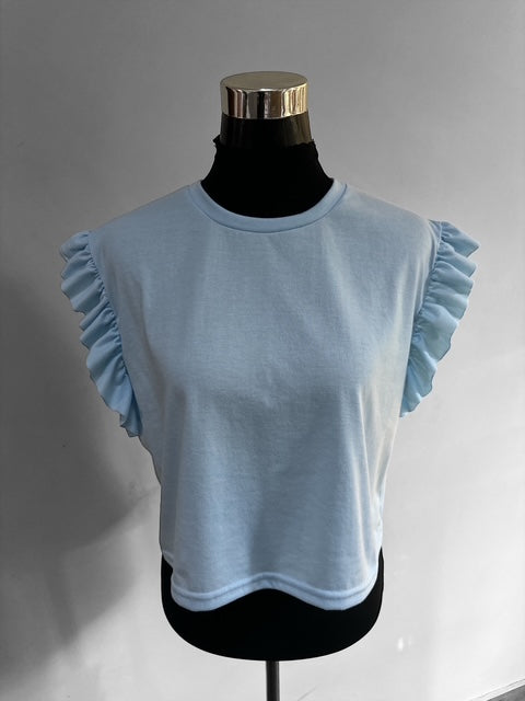 Descubre la elegancia y el confort con nuestra Camiseta Corta, diseñada para ofrecer un toque distintivo a tu vestuario. Con un cuello redondo clásico y mangas cortas adornadas con delicados volados, esta prenda combina un estilo atemporal con un detalle sutil que realza su sofisticación.